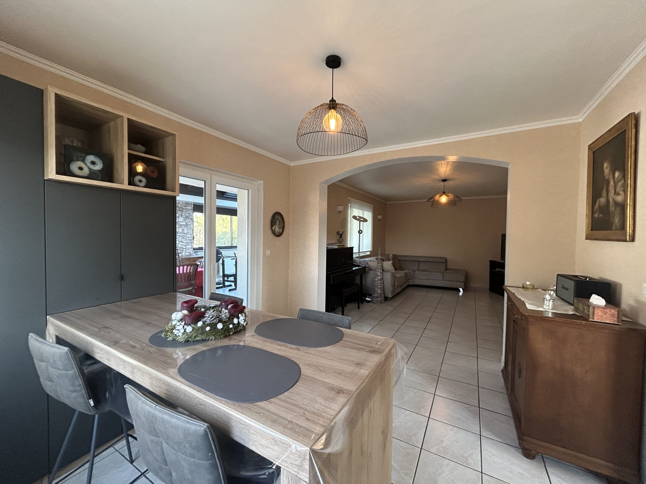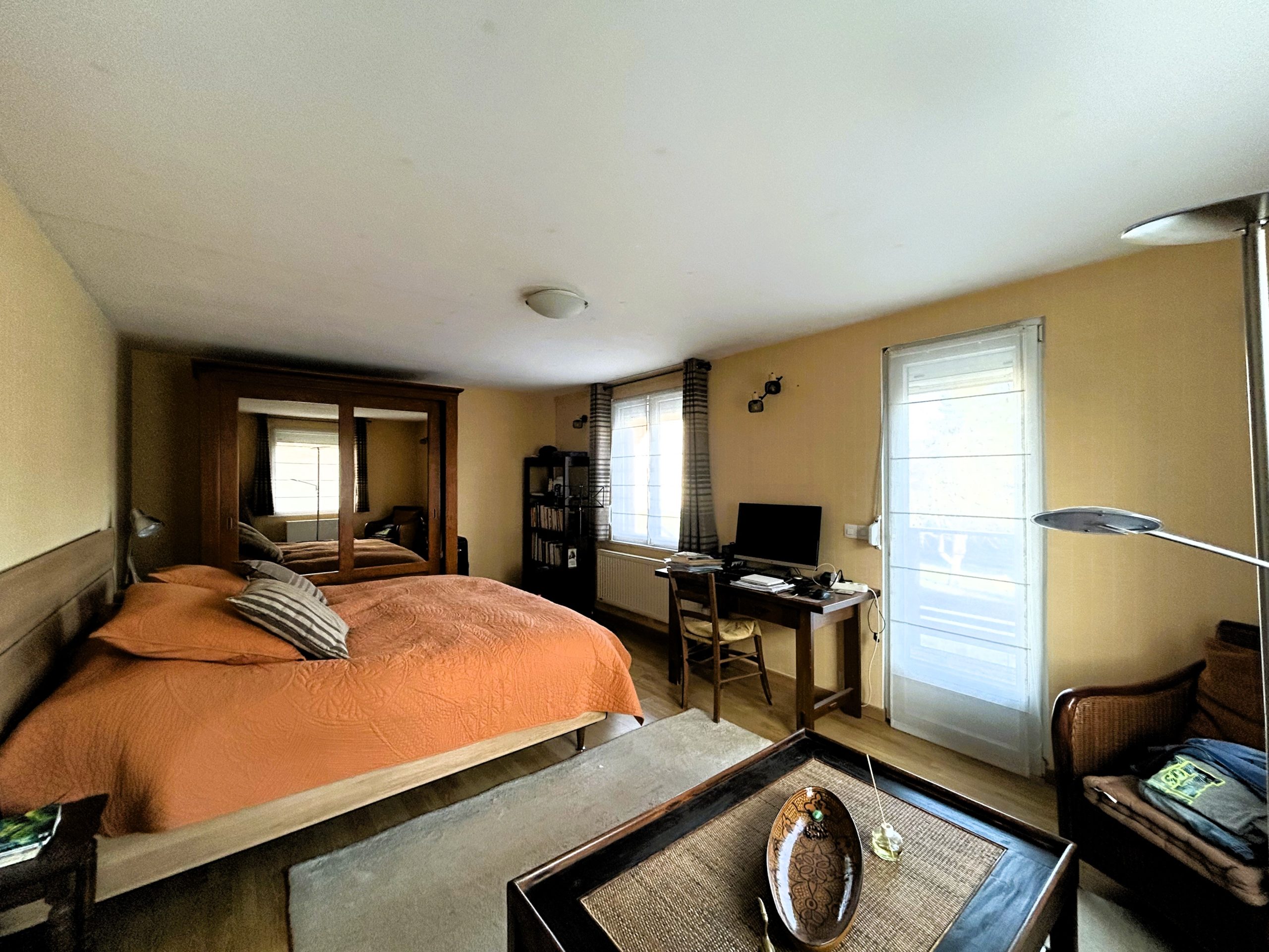 NIVEAU RDC : une entrée, une grande chambre de 20 m², cuisine équipée de 2021 récente de style contemporain semi-ouverte sur salle à manger et séjour avec cheminée, extension vitrée de 30 m² avec accès terrasse de plain pied, un WC.
