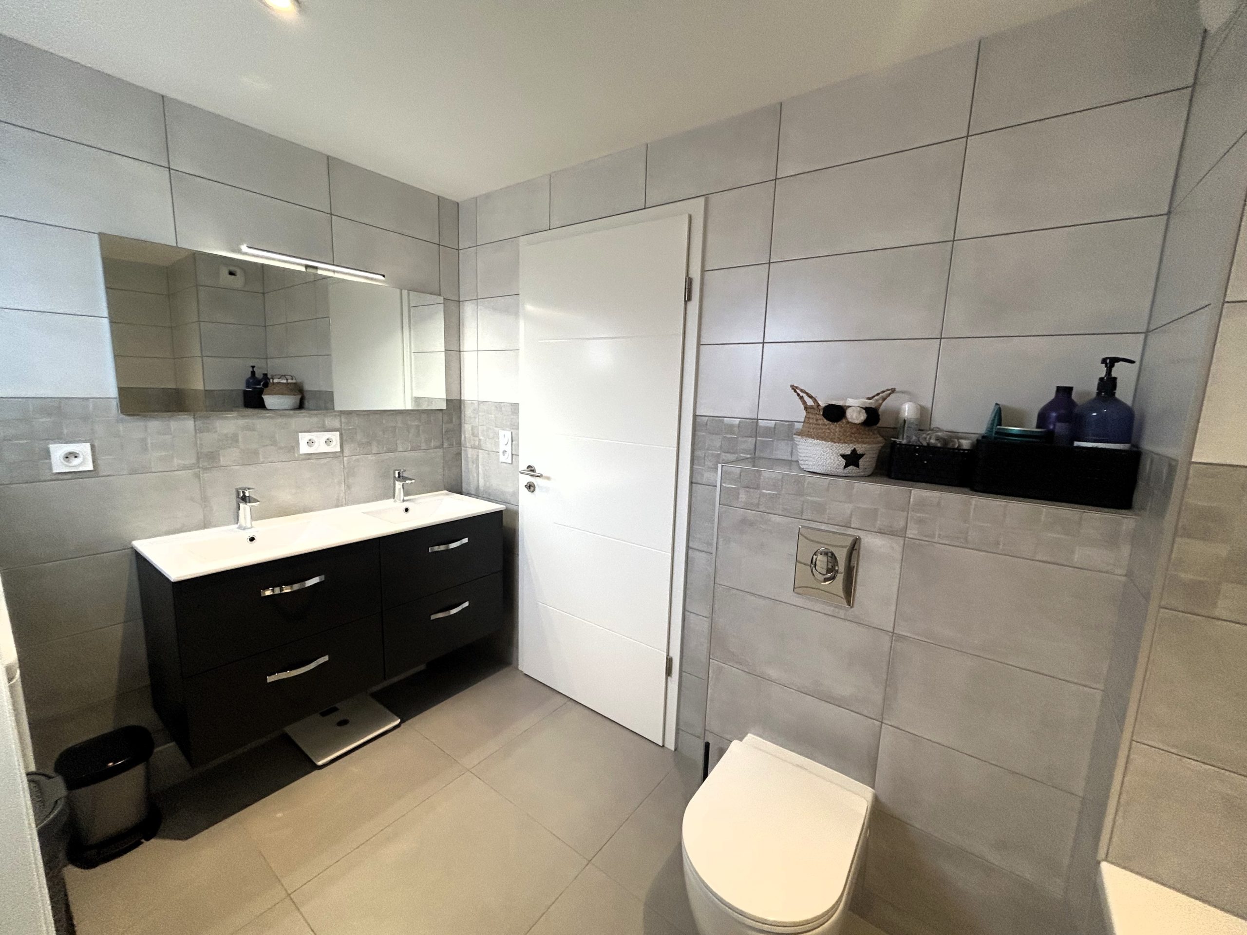 Au rez-de-chaussée : d’une entrée avec placard de rangement, d’un W.C avec lave mains, fenêtre et placard de rangement, d’un espace à vivre de 35m² comprenant une cuisine équipée ouverte sur le salon séjour, le tout donnant accès à une terrasse de 12m² avec petit jardin privatif.